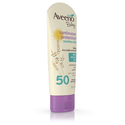 Aveeno Baby Continuous Protection Sensitive - Zinc Oxide with Broad Spectrum Skin Lotion Sunscreen - SPF 50 - 3 fl oz. CeraVe SPF 50 Sunscreen Face Lotion. Aveeno Baby Continuous Protection Sensitive Skin Sunscreen Lotion with Broad Spectrum SPF 50 contains skin-soothing oat and naturally-sourced 100 zinc oxide active ingredient.